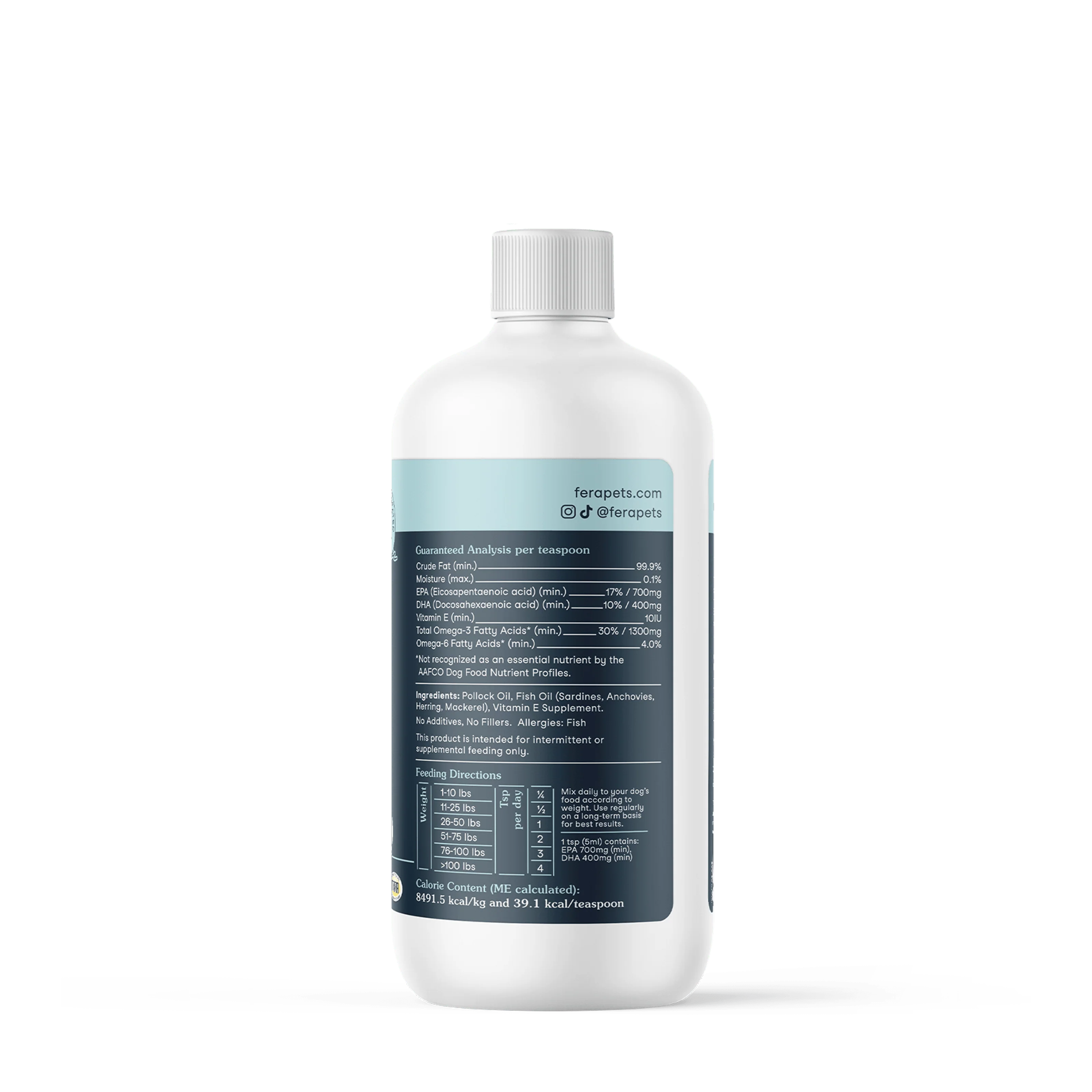 Fera's Fish Oil contains high amounts of EPA and DHA Omega-3 essential fatty acids per teaspoon compared to other leading brands, making it the go-to fish oil for your pet. No additives, no fillers and no toxins!