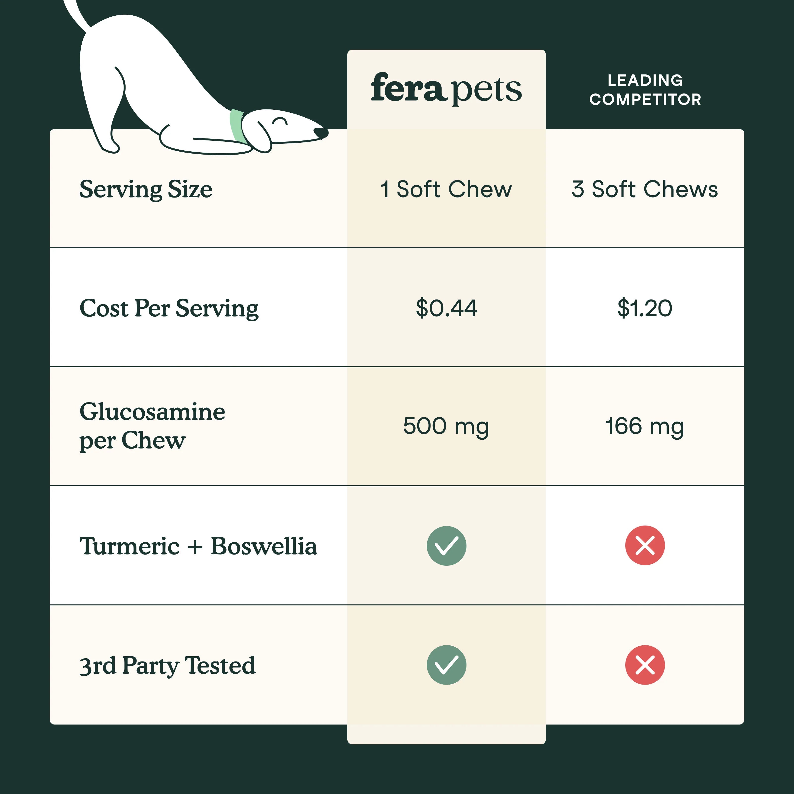 Let's face it, every joint support pet supplement contains the widely known glucosamine, msm & chondroitin. While the common trio is expected, Fera goes beyond the ordinary and incorporates Eastern and Holistic ingredients like Organic Turmeric, Green Lipped Mussel and Yucca Root.