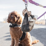 Made with high-quality & lightweight material, the Poopy Loop holds onto your used dog waste bag and conveniently clips onto your leash.