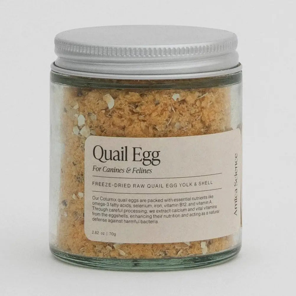 Our eggs come from Jumbo Coturnix Quails which results in larger eggs. This topper is crafted from the entire quail egg — yolk, white, and shell — freeze-dried raw to preserve nutritional architecture. The result is a finely textured topper that adds depth, flavor, and concentrated nutrition to any bowl—without synthetics.