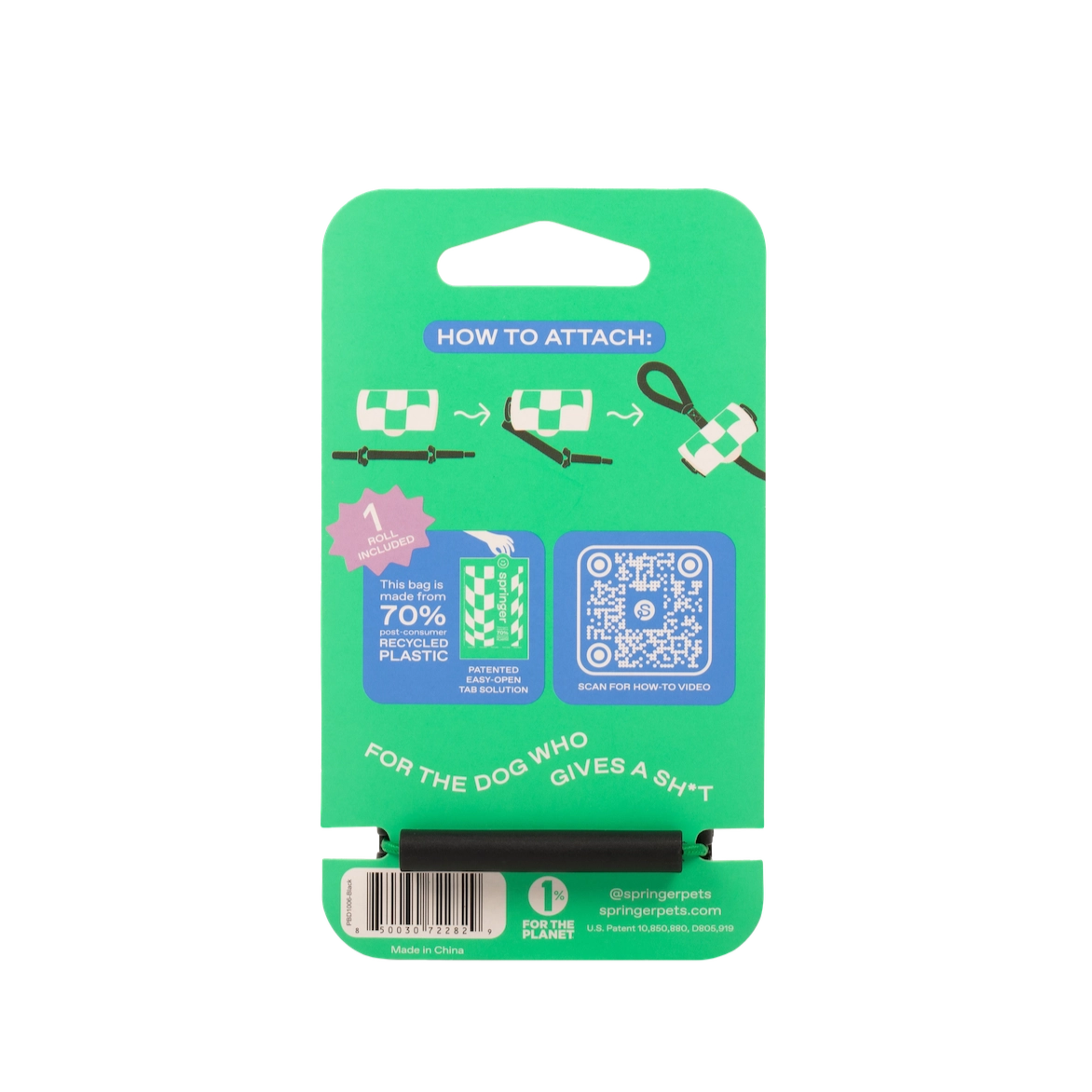 Introducing our Dog Poop Bag Dispenser—an essential tool for dog owners seeking convenience and reliability on daily walks. Its sleek, compact design easily attaches to your leash, bag, or fits in your pocket—no more worrying about poop bags unraveling when you need them most! With the included poop bag roll, each bag is intentionally made from 70% post-consumer recycled plastic and includes our patented Easy-Open Tab design for seamless bag access every time.