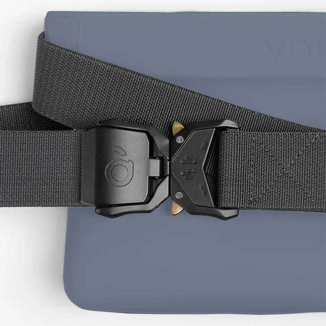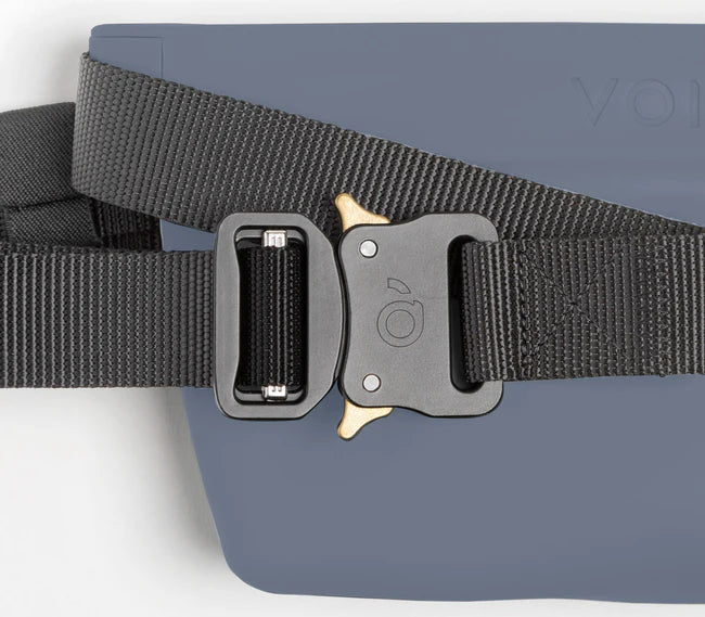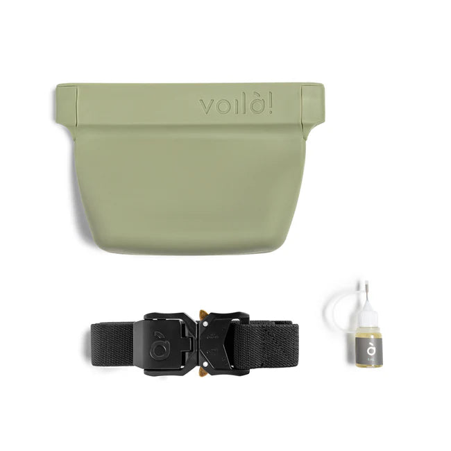 SECURE THE BUCKLE:Thread the belt’s excess length through the elastic loop. Lock the buckle in place by connecting both ends until you hear an audible click. The Voilà logo should face out.