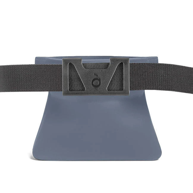 ATTACH THE BELT:Thread the belt’s rounded end into the right opening and out of the left opening of the plastic sleeve. Slide the elastic loop over the rounded end toward the pouch.
