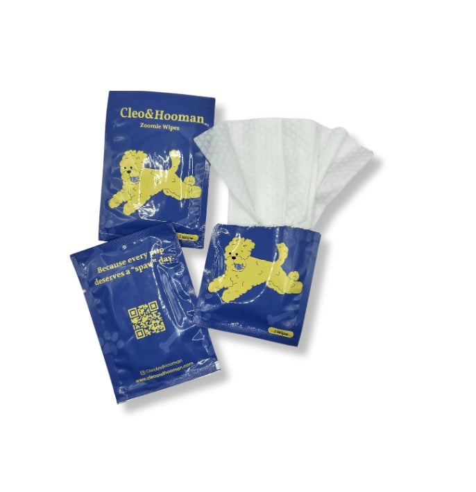 Unlock the convenience of instant freshness anywhere with Cleo & Hooman's Zoomie Wipes – your pup's portable "spaw" day. Specially crafted for the pet that's going places, these gentle wipes are designed for the body, muzzle, paws, and yes, even butts, ensuring your furry friend stays clean, comfortable, and ready for whatever comes next.