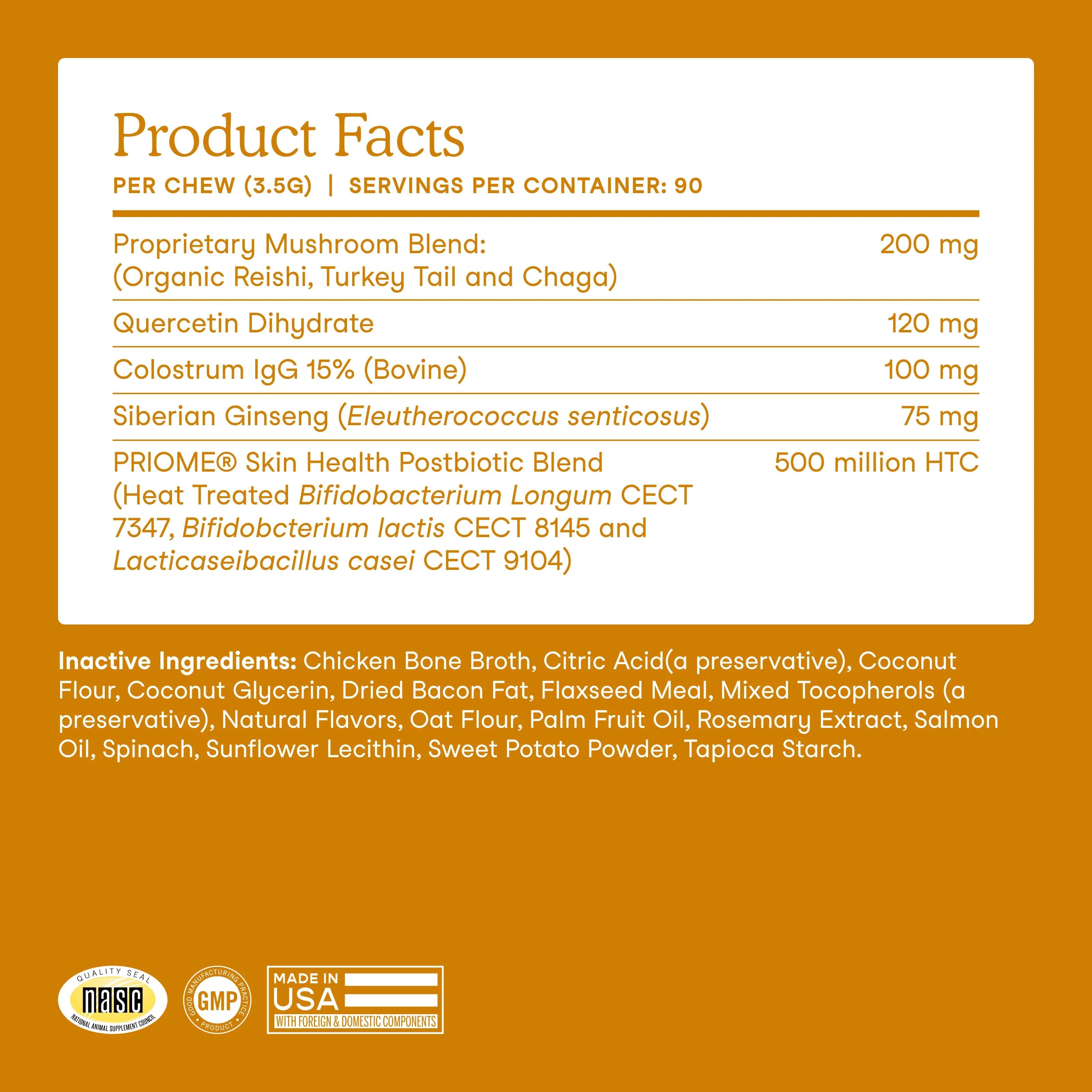 Inactive Ingredients: Chicken Bone Broth, Citric Acid (a preservative), Coconut Flour, Coconut Glycerin, Dried Bacon Fat, Flaxseed Meal, Mixed Tocopherols (a preservative), Natural Flavors, Oat Flour, Palm Fruit Oil, Rosemary Extract, Salmon Oil, Spinach, Sunflower Lecithin, Sweet Potato Powder, Tapioca Starch.