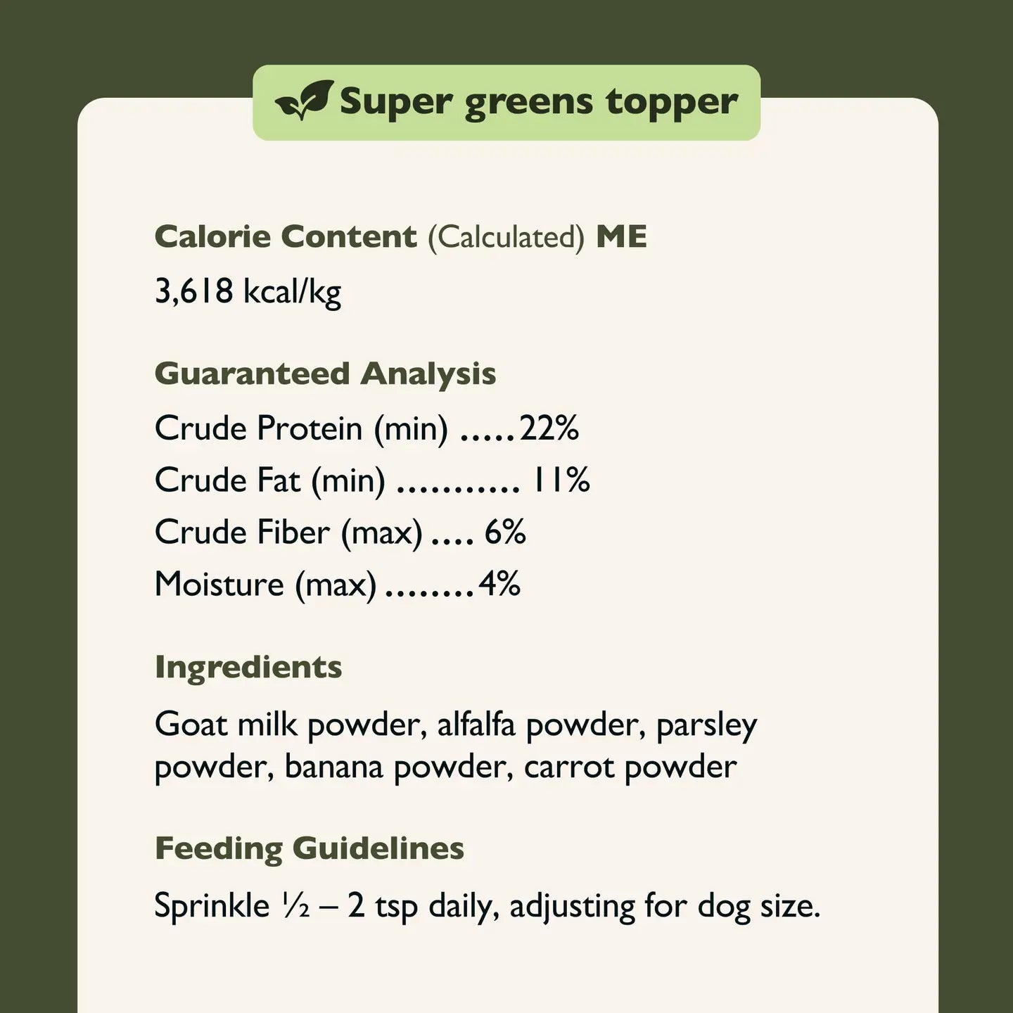 A nutrient-rich topper made with gentle goat milk and naturally nourishing green ingredients. Alfalfa, parsley, banana, and carrot powders come together to create a clean, versatile blend you can sprinkle, mix, or whisk into a light milk drink. Perfect for boosting everyday meals, supporting picky eaters, and adding simple, plant-based variety to your dog’s routine. No added sugar. No artificial colors or preservatives. Made in small batches in Washington, USA.